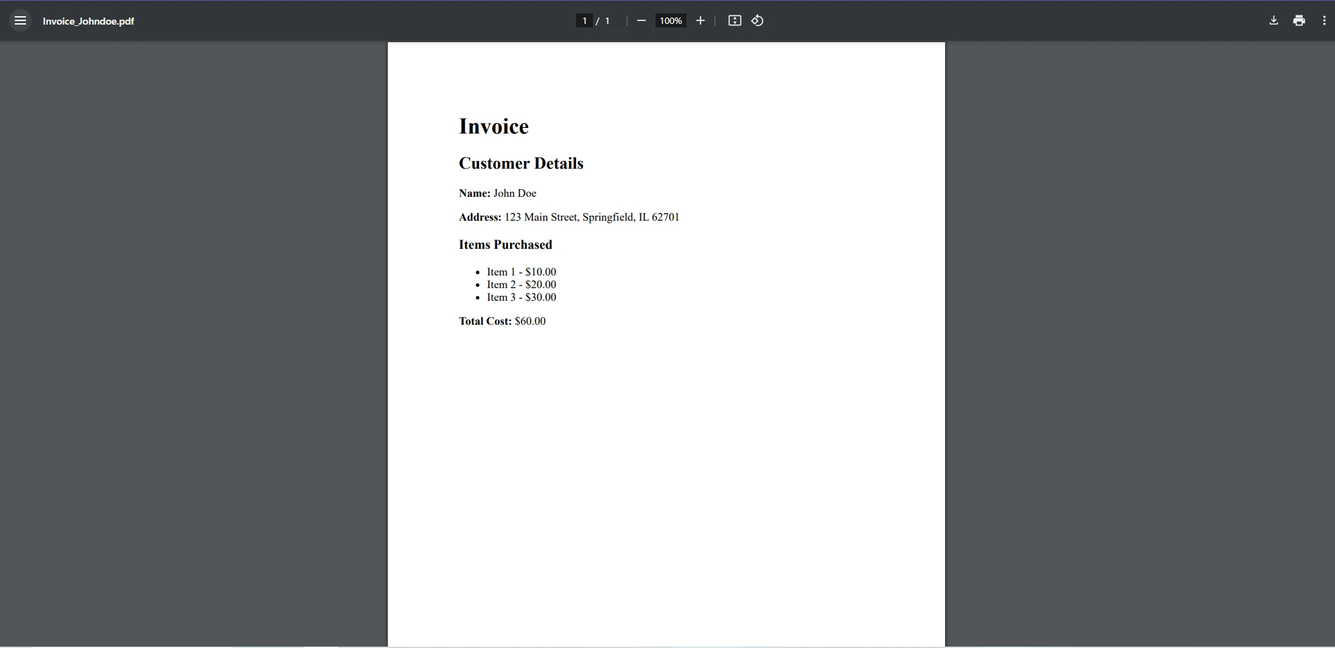 • HTML to PDF Conversion: After creating the invoice content in HTML format, we use IronPDF’s RenderHtmlAsPdf() method to generate a PDF. The result is saved as Invoice_Johndoe.pdf.