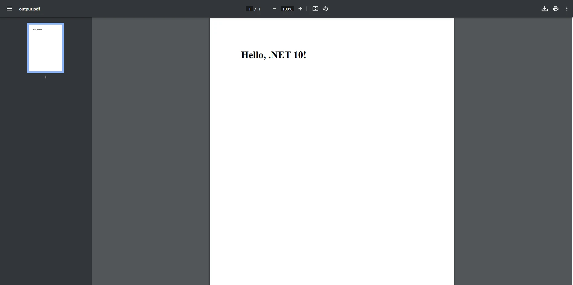 var pdf = renderer.RenderHtmlAsPdf("<h1>Hello, .NET 10!</h1>");