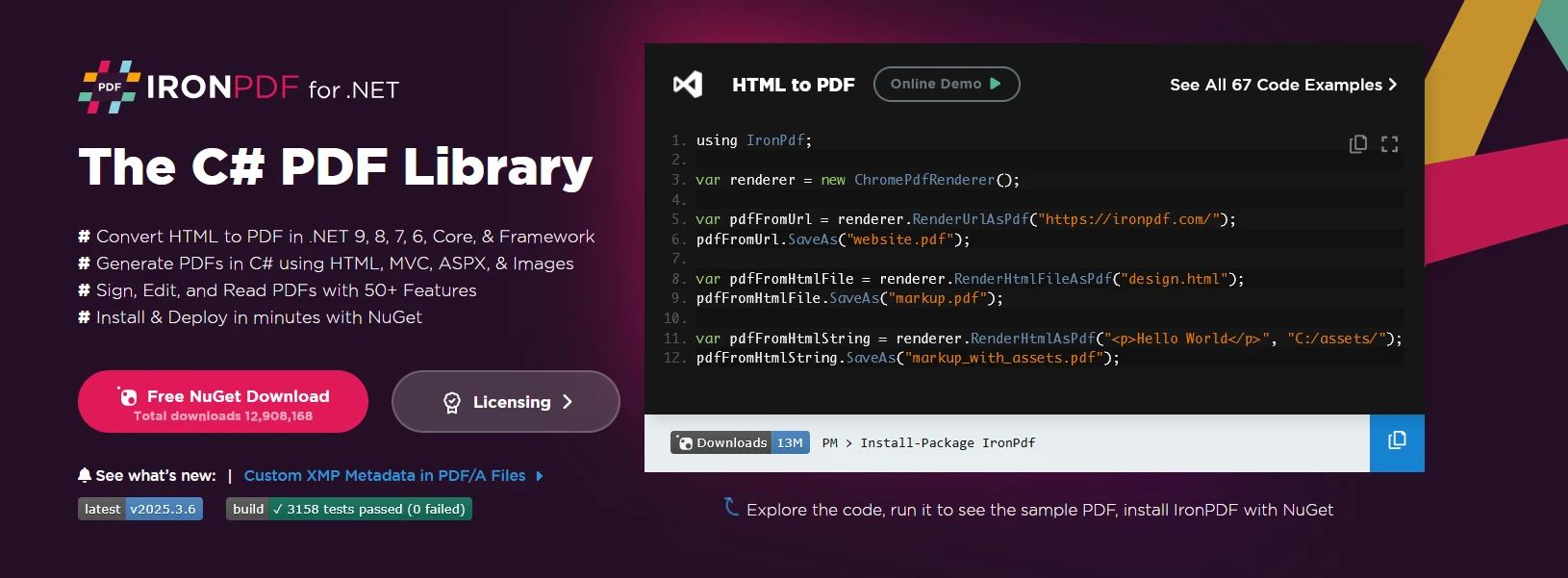 IronPDF is a professional-grade library designed for .NET developers to effortlessly convert HTML content into high-quality PDFs. Known for its reliability, advanced features, and ease of use, IronPDF streamlines the development process while delivering precise rendering and robust functionality. Here’s why IronPDF is a standout solution:
