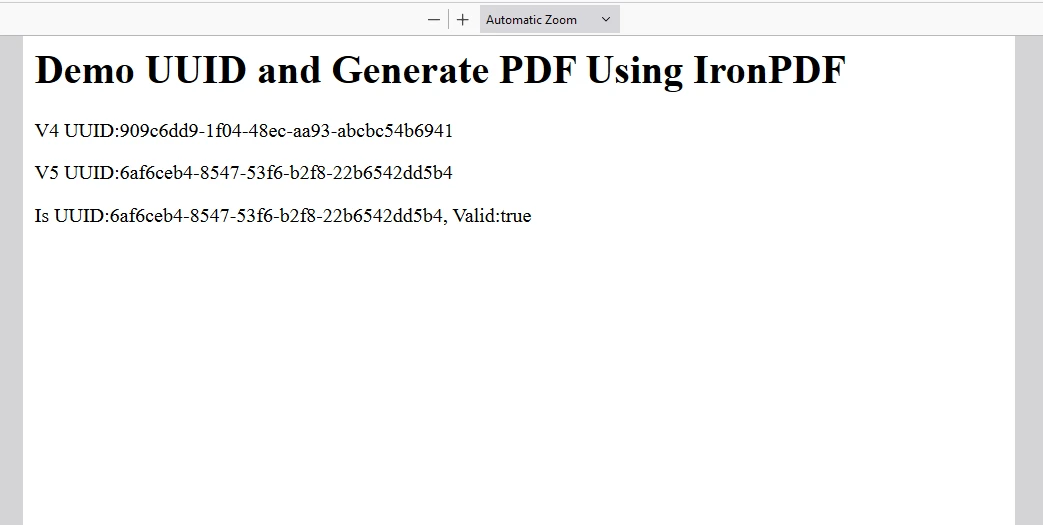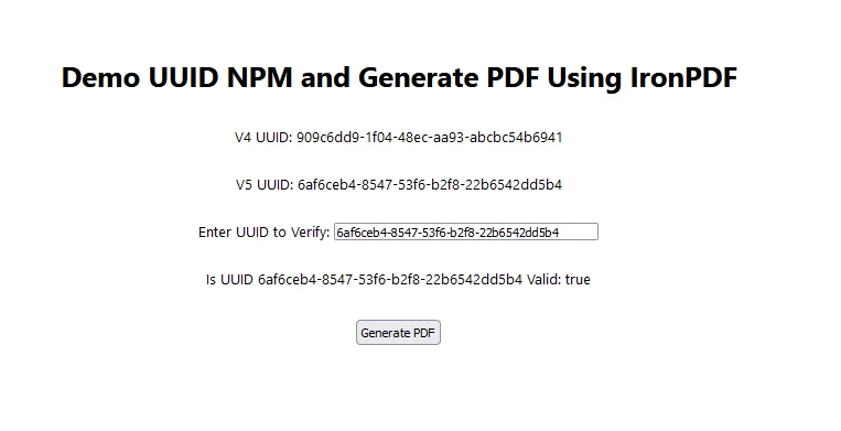 <h1>Demo UUID NPM and Generate PDF Using IronPDF</h1>